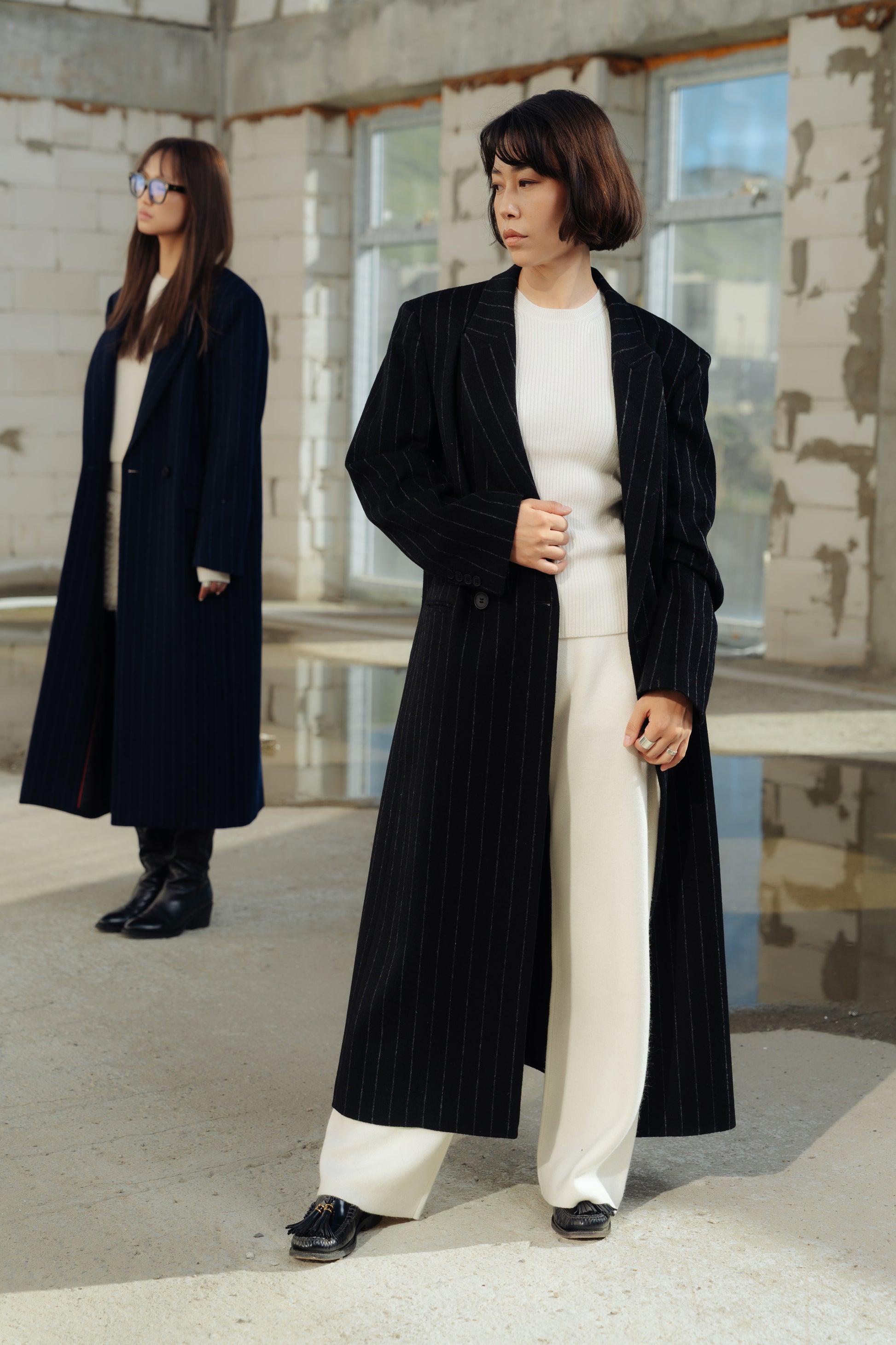 Defined by a long, fluid silhouette and structured shoulders, offering refined warmth and timeless sophistication.